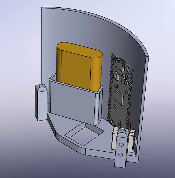 The purple box has now been renamed to Transmitting Garage Door, or TGD. Due to the nature of the housing being inserted via a rail mount into the side of our parachute bay the name was devised. TGD now houses a 18650 battery for the IREC competition and a lithium ion battery for the Launch Canada competition. The transmitting Pico-PCB is now attached to the curved outer surface using screws and standoffs with the screw switch being attached to one of the rails. A small cutout at the bottom allows for wires from the avionic stack on the other end of bulkhead to be passed through and be connected to the PCB, to allow for a signal from the altimeter at 1500 ft to dis-reef. The design was completed by another member of the team with regular feedback from me and multiple other senior leads.